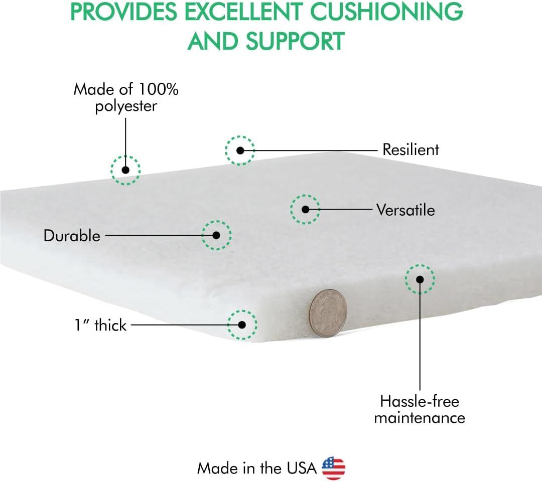 Elevate your seating experience with the Fairfield NuFoam Pad, the perfect blend of comfort and durability! Our foam pads, crafted from high-quality densified polyester batting, redefine relaxation. Perfect for a myriad of applications, including chair cushions, deck furniture, camping gear, futons, playpens, and even vehicle accessories, it ensures unparalleled cushioning and resilience. Designed with uncompromising durability in mind, our foam pad consists of compressed 100% polyester layers ranging from 1″ to 4″ thick. We recommend you choose Fairfield NuFoam Pad that's 1 inch thicker than your cushion for a comfy fit. This extra thickness allows for a snug fit after compression, ensuring lasting comfort. The craft foam, resistant to mildew growth, does not yellow or disintegrate. Plus, it's incredibly easy to clean. You can simply hand wash them and allow them to air dry. Made from recycled materials and meticulously crafted in the USA, this foam pad is a great solution whether you’re revamping your patio furniture or enhancing your camping experience. Say goodbye to discomfort and hello to leisure with our premium foam pads. Experience the difference today!