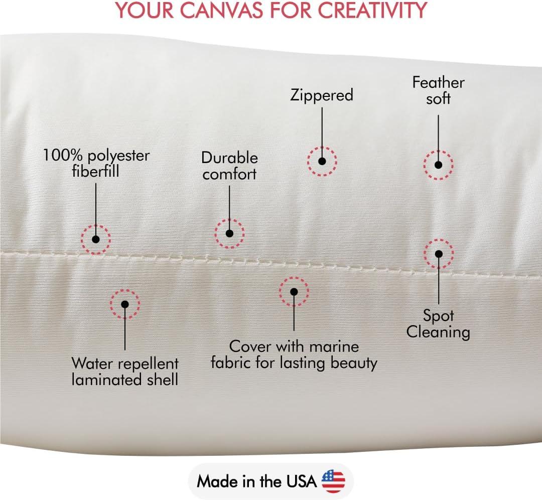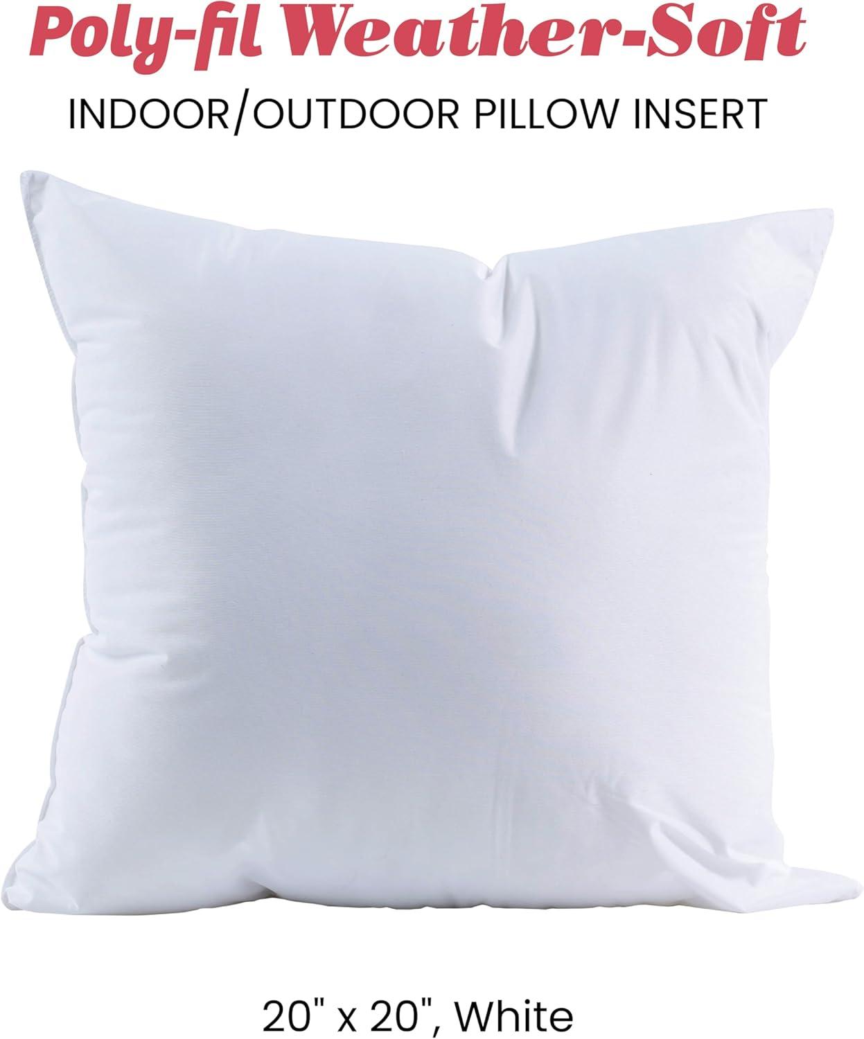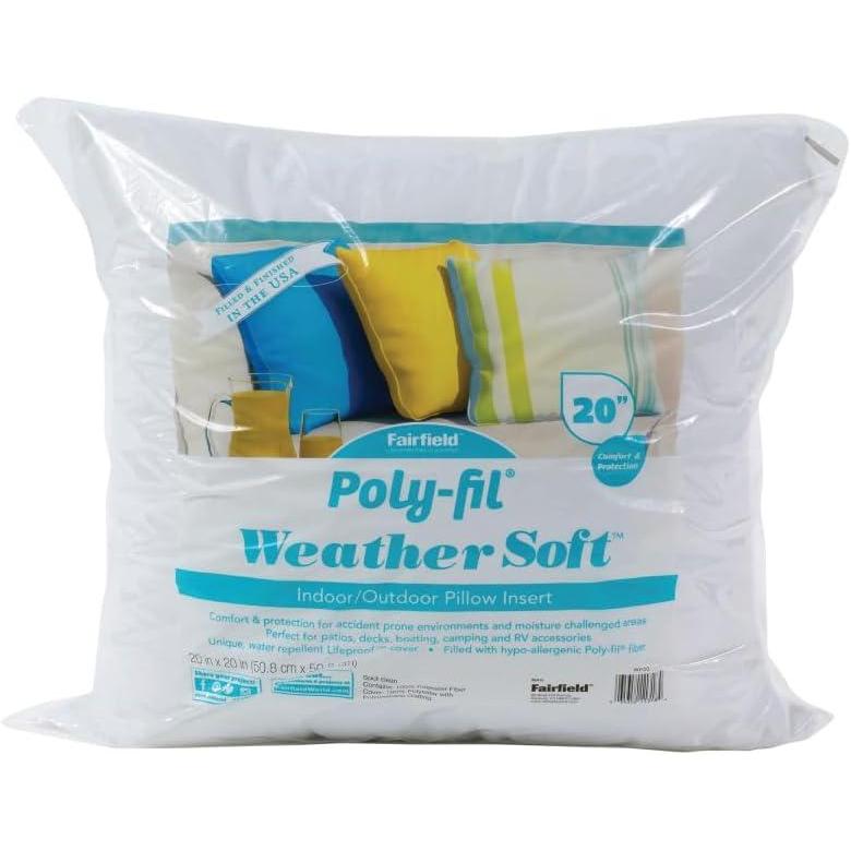 Soft, comfortable Poly-Fil Weather Soft pillow inserts have a water repellent shell that keeps the 100% polyester fiberfill interior from getting wet in damp or rainy weather. With Poly-Fil Weather Soft you have the freedom to decorate your outdoor space using a variety of fabrics style you prefer, including marine and outdoor fabrics. The 20″ x 20″ Poly-fil Weather Soft Pillows are durable and comfortable for patio and deck furnishings, boating, camping and RV accessories. The 20″ x 20″ pillow is great on patio and deck furniture to add extra comfort, it is also great to use as comfort pillows for boating. Care: Protect the pillow from severe wet weather for best results and prolonged lifespan. Submersing pillow or prolonged exposure to heavy rain will result in varying levels of moisture absorption. Spot cleaning recommended.